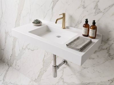 Les fixations invisibles offrent une esthétique épurée, sans vis ni attaches apparentes. La tuyauterie et le siphon sont dissimulés.